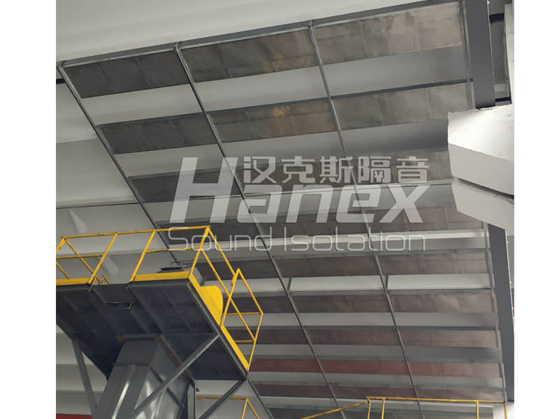 1、經杭州漢克斯隔音技術人員現場踏勘發現,破碎機生產線工作運行時,其產生的噪聲一部分通過屋面繞射至居民區。因此,在生產車間內的破碎機正上方區域設計安裝吸音吊頂。