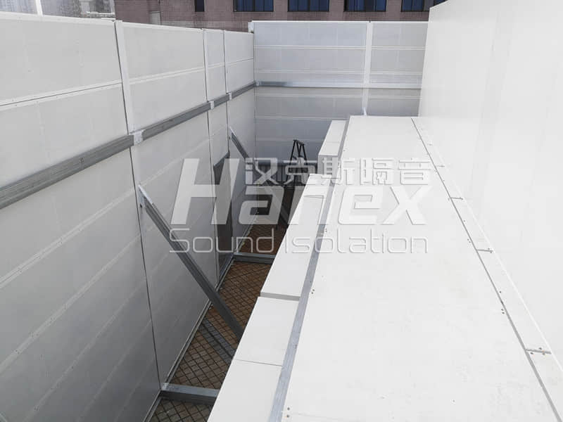 2)安裝進(jìn)風(fēng)消聲百葉:為保證3組空調(diào)機(jī)組進(jìn)風(fēng)量需求及罩內(nèi)設(shè)備通風(fēng)散熱,整體隔聲罩四周設(shè)計(jì)安裝進(jìn)風(fēng)消聲百葉;